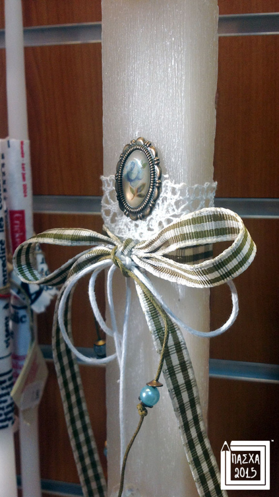 – Λαμπάδα πλακέ Τριανταφυλλάκι με καρό κορδέλα: 10,00 ευρώ